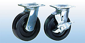 Колесные опоры промышленные поворотные и поворотные с тормозом, обод - прессованный из листовой стали, оцинкован, шинка из полуэластичной черной резины, болтовое крепление